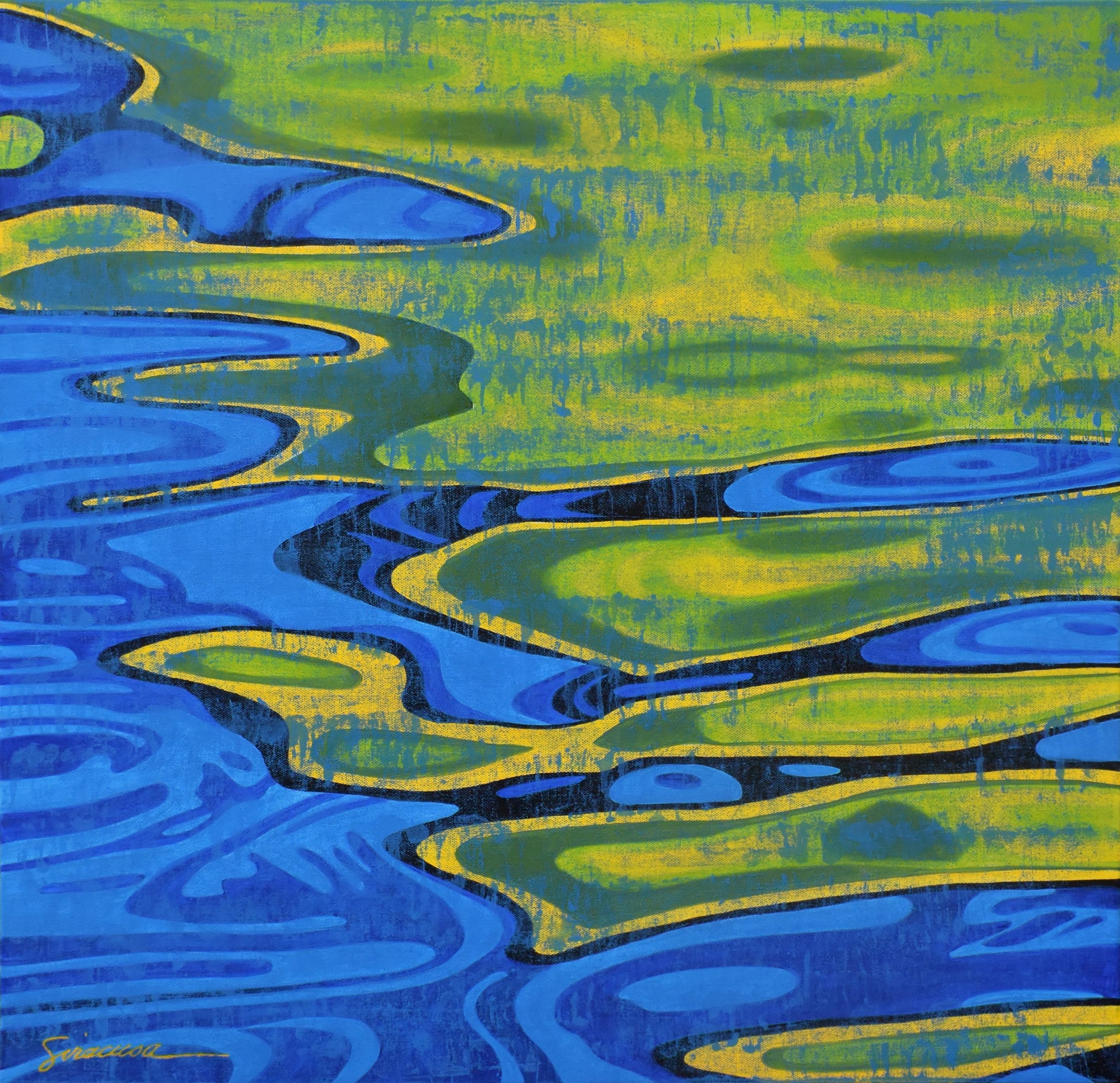 As the sun sets, its warm reflections of green and yellow glide across the surface, dancing in contrast against rich cerulean blues. This piece captures that fleeting moment when daylight meets the tide, a gentle current, a shifting palette, a quiet breath of the ocean’s evening rhythm. A serene celebration of contrast and harmony within the sea.